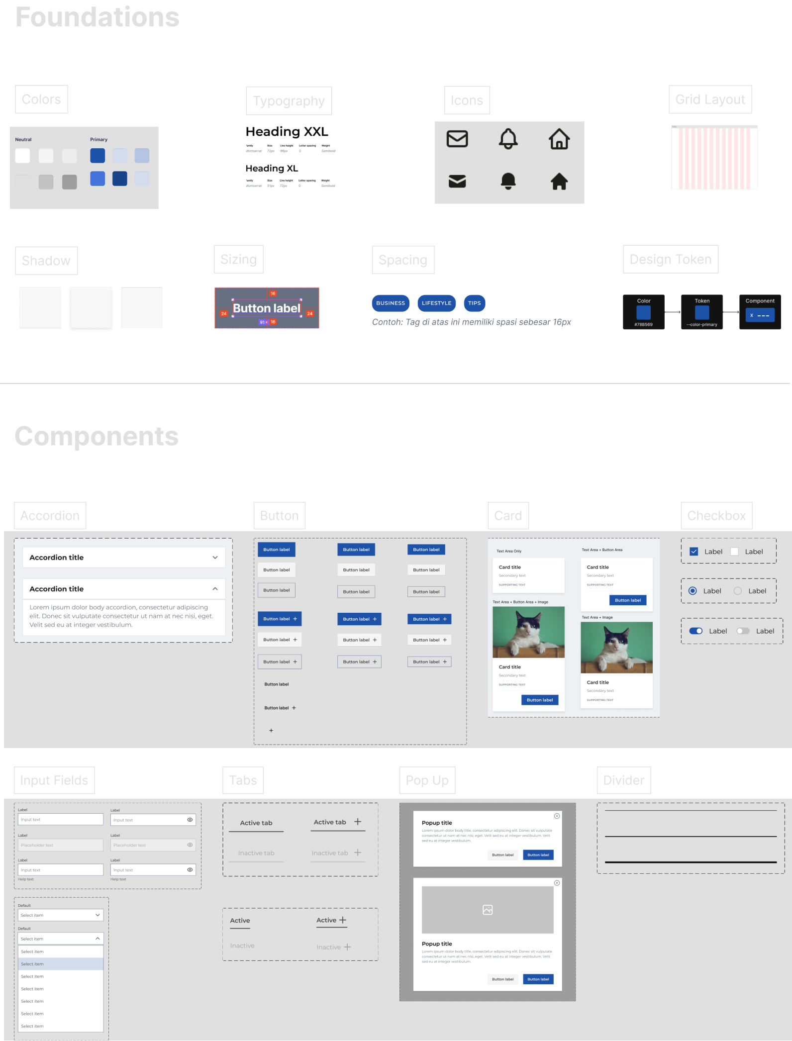 After that, we create a default reusable UI component library that can be used by designers and developers in working on a project. UI Component library includes 8 UI components and their variants. In addition, Foundations are also designed which contain basic visual elements for designing a project.